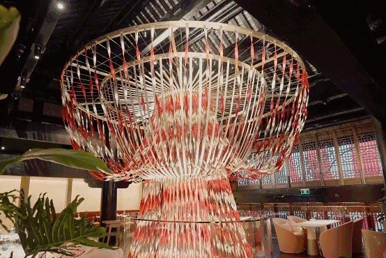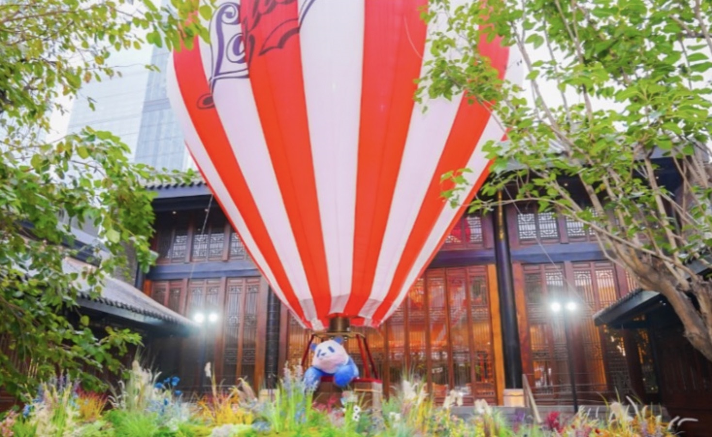 相比成都遠(yuǎn)洋太古里古典原生建筑,LV餐廳以彩色熊貓、當(dāng)季品牌主元素紅色熱氣球作中庭布置,在傳統(tǒng)氛圍中滲透品牌文化痕跡。