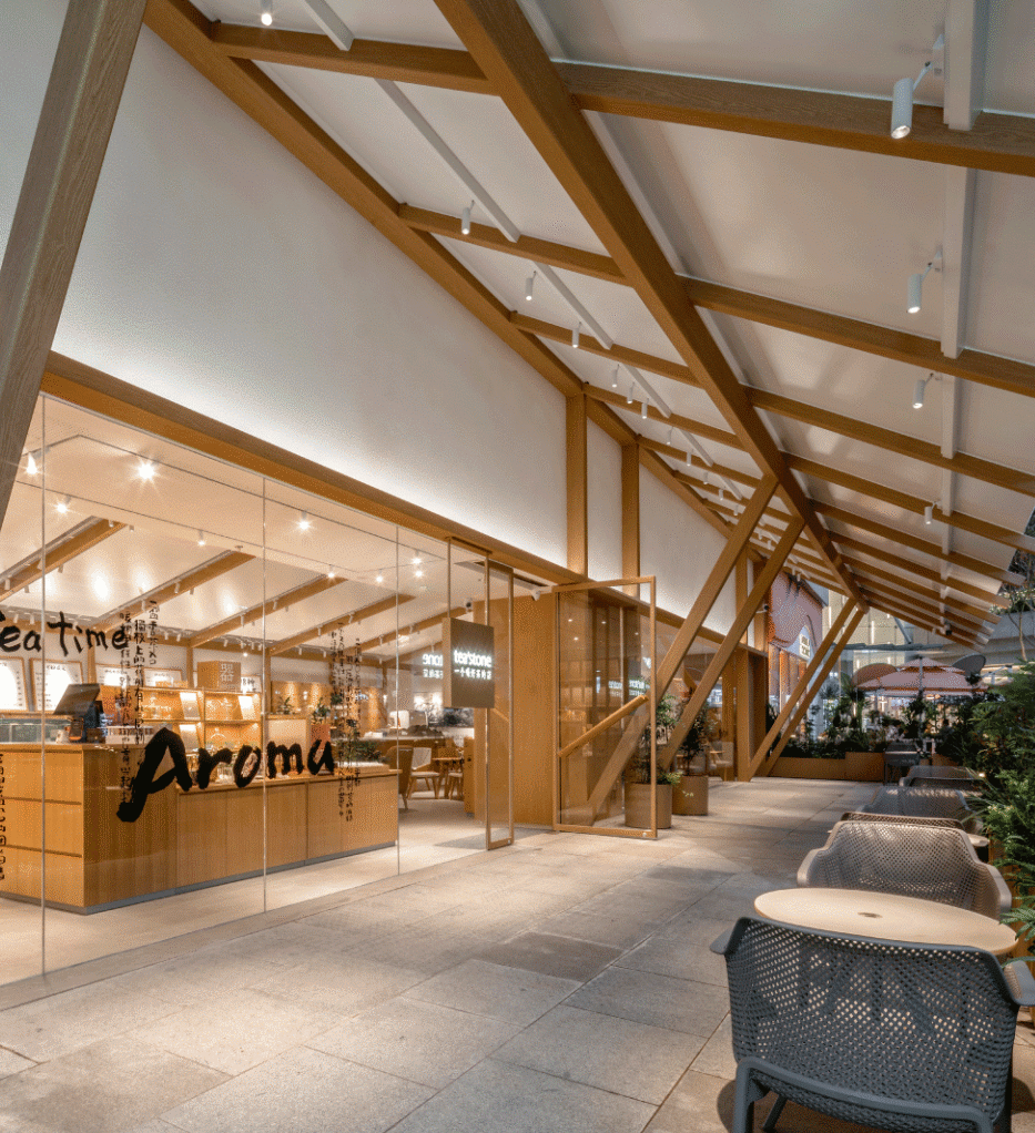整體造型類似深圳萬(wàn)象天地的品牌首店,內(nèi)部的創(chuàng)新中心以茶鋪的“斜撐涼棚”為靈感,結(jié)合淺色方木撐和純白無(wú)飾大招展棚面打造外擺去棚架,也使得外立面具有清雅美學(xué)視感。