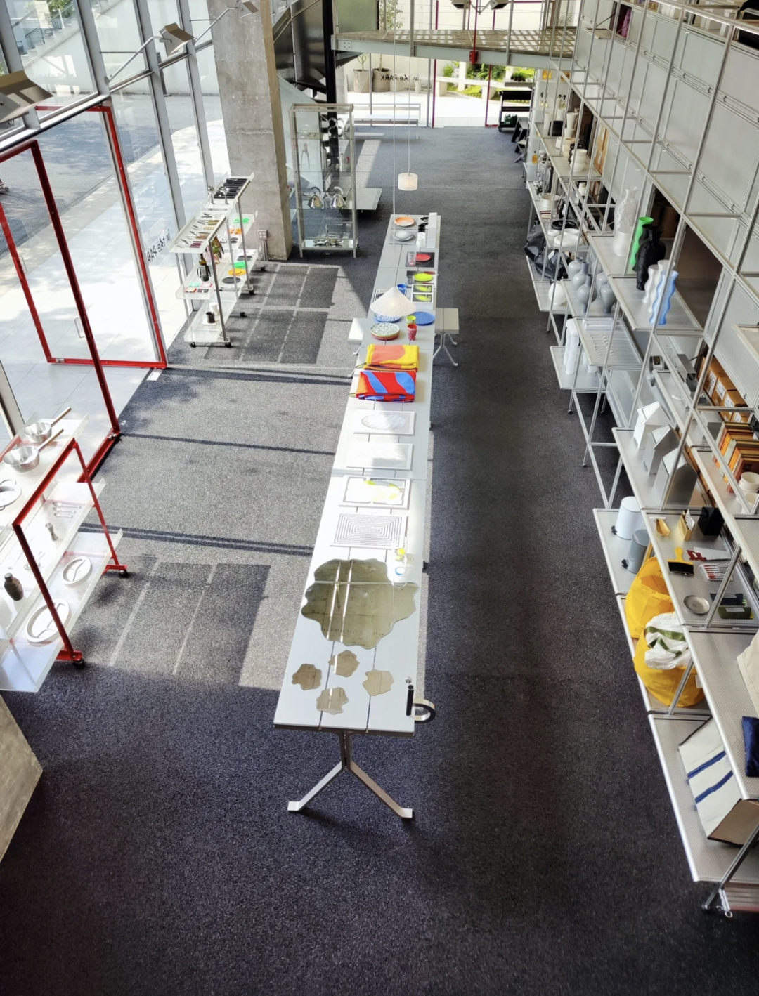 店內(nèi)空間布局極其簡(jiǎn)約,橫條式長(zhǎng)桌和陳列臺(tái)排開,與門面光線相迎,敞亮和諧。