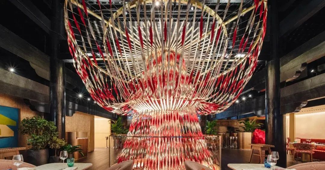 雙層餐廳內(nèi)部視覺(jué)裝置由Atelier o?設(shè)計(jì)珊瑚色吊燈,珊瑚色也貫穿至椅背、頂燈設(shè)計(jì)中,成為店內(nèi)空間重要的記憶元素。