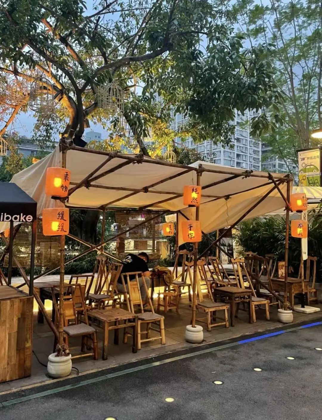 室外區(qū)域,極具成都味道的竹椅板凳、涼亭麻布為顧客打造中式的復(fù)古環(huán)境氛圍。與門店位于環(huán)太古里片區(qū)且緊鄰繞成河府南河。
