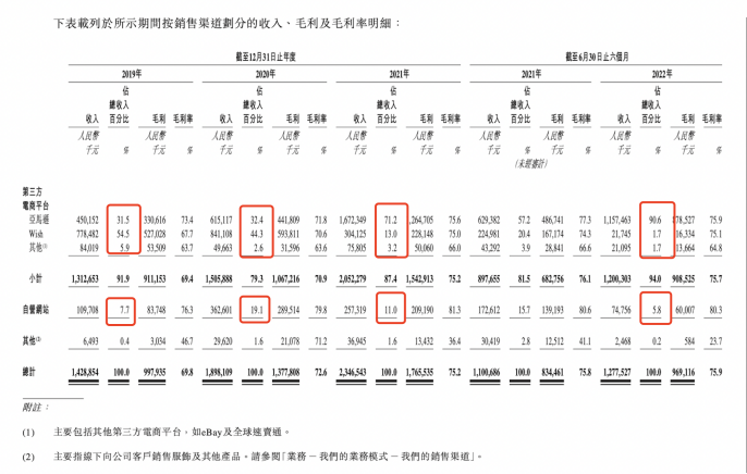 首先是嚴(yán)重的亞馬遜依賴癥。子不語(yǔ)的銷(xiāo)售渠道主要分為第三方電商平臺(tái)和自營(yíng)網(wǎng)站。招股書(shū)顯示,2019年~2021年,子不語(yǔ)來(lái)自第三方電商平臺(tái)的收入分別占比91.9%、79.3%、87.4%,2022年上半年進(jìn)一步增長(zhǎng)至94.0%。