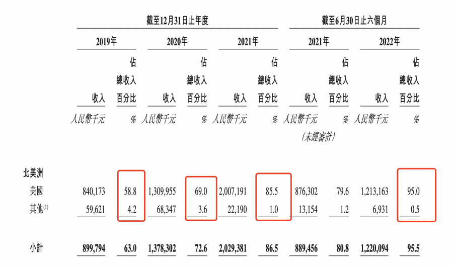 其次是區(qū)域依賴癥。雖然子不語(yǔ)稱(chēng)產(chǎn)品銷(xiāo)售全球超過(guò)80%的國(guó)家及地區(qū)的終端客戶,但主要還是在歐美市場(chǎng)。截止2022上半年,子不語(yǔ)在北美洲的收入占總收入的95.5%,其中美國(guó)占據(jù)95%;來(lái)自歐洲的收入占總收入的3.6%;而來(lái)自亞洲的僅有0.3%。