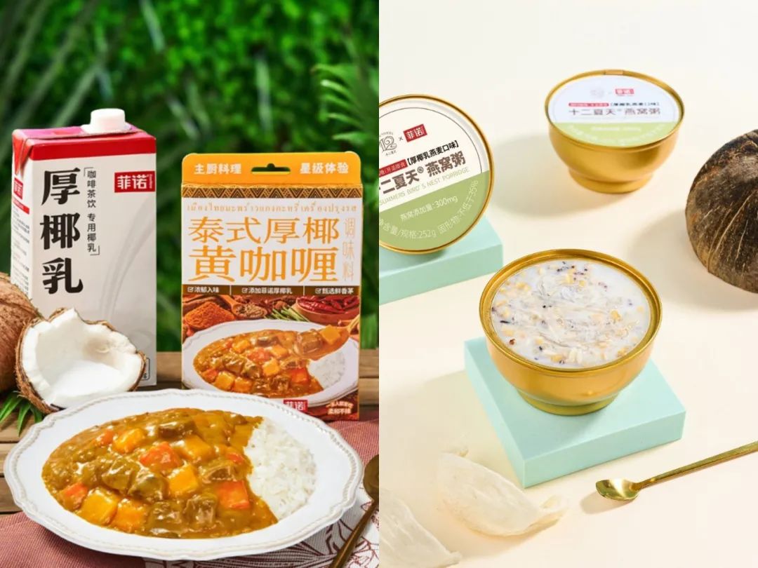 菲諾還與加點滋味聯(lián)名推出泰式厚椰黃咖喱,與十二夏天聯(lián)名推出厚椰乳燕窩粥,兩款產(chǎn)品中都加入了椰乳作為原料。