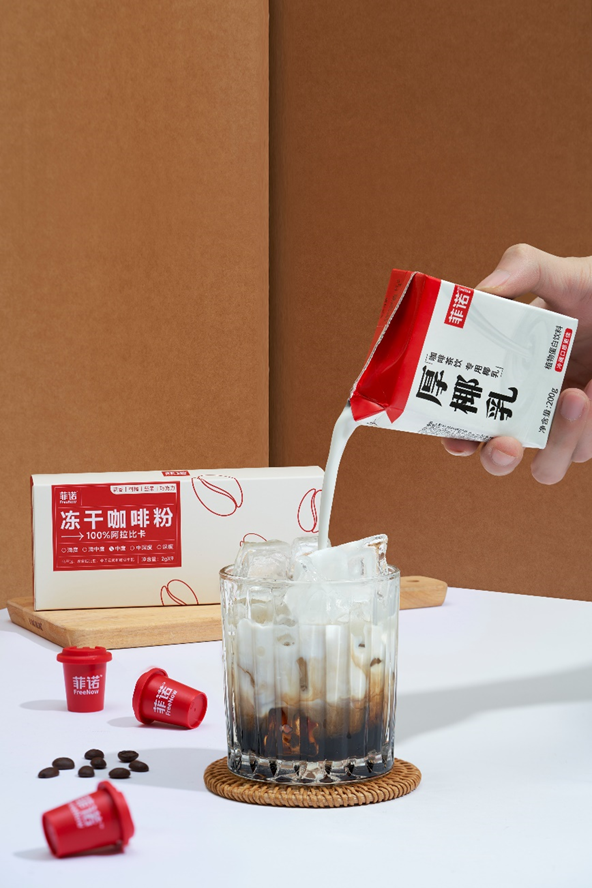 在生椰拿鐵粉絲們的“千呼萬喚”中,菲諾在今年5月推出了RTD產(chǎn)品生椰小拿鐵;10月,又推出了一步到“味”的厚椰乳+凍干咖啡粉的組合裝。
