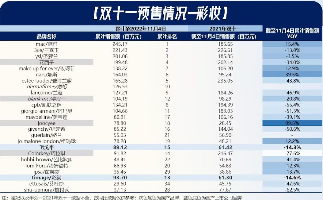 天貓雙11首輪預售彩妝品牌排行榜及增速,摘自信達新消費,數(shù)據(jù)來源:魔鏡市場情報