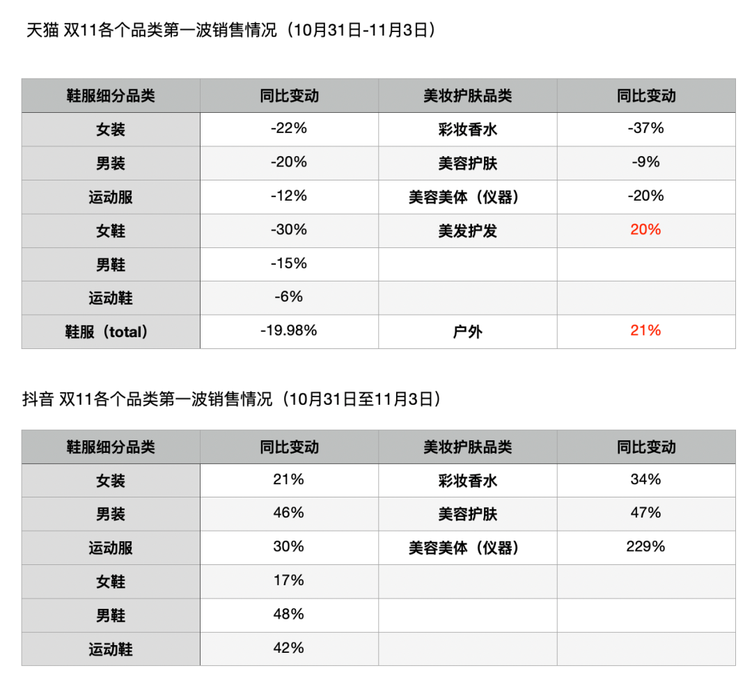 天貓首輪銷售,彩妝香水品類同比下滑37%,甚至高于618大促期間20%-30%的跌幅。抖音雙11首輪銷售同比增長34%,但較過去動輒翻番的增長也有較大差距。