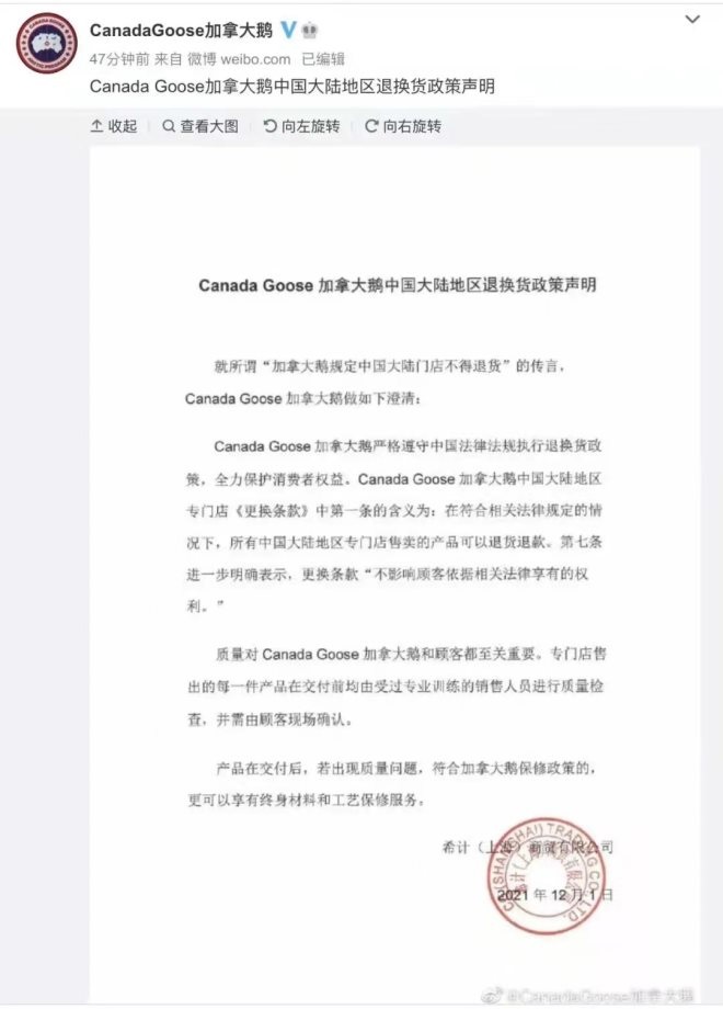 最終迫于多方壓力下,加拿大鵝改口稱在符合相關(guān)法律規(guī)定的情況下,所有中國(guó)大陸地區(qū)專門店售賣的產(chǎn)品可以退貨退款,但國(guó)內(nèi)消費(fèi)者對(duì)加拿大鵝的好感度一落千丈。負(fù)面事件發(fā)酵后,加拿大鵝市值更是10天蒸發(fā)84億。