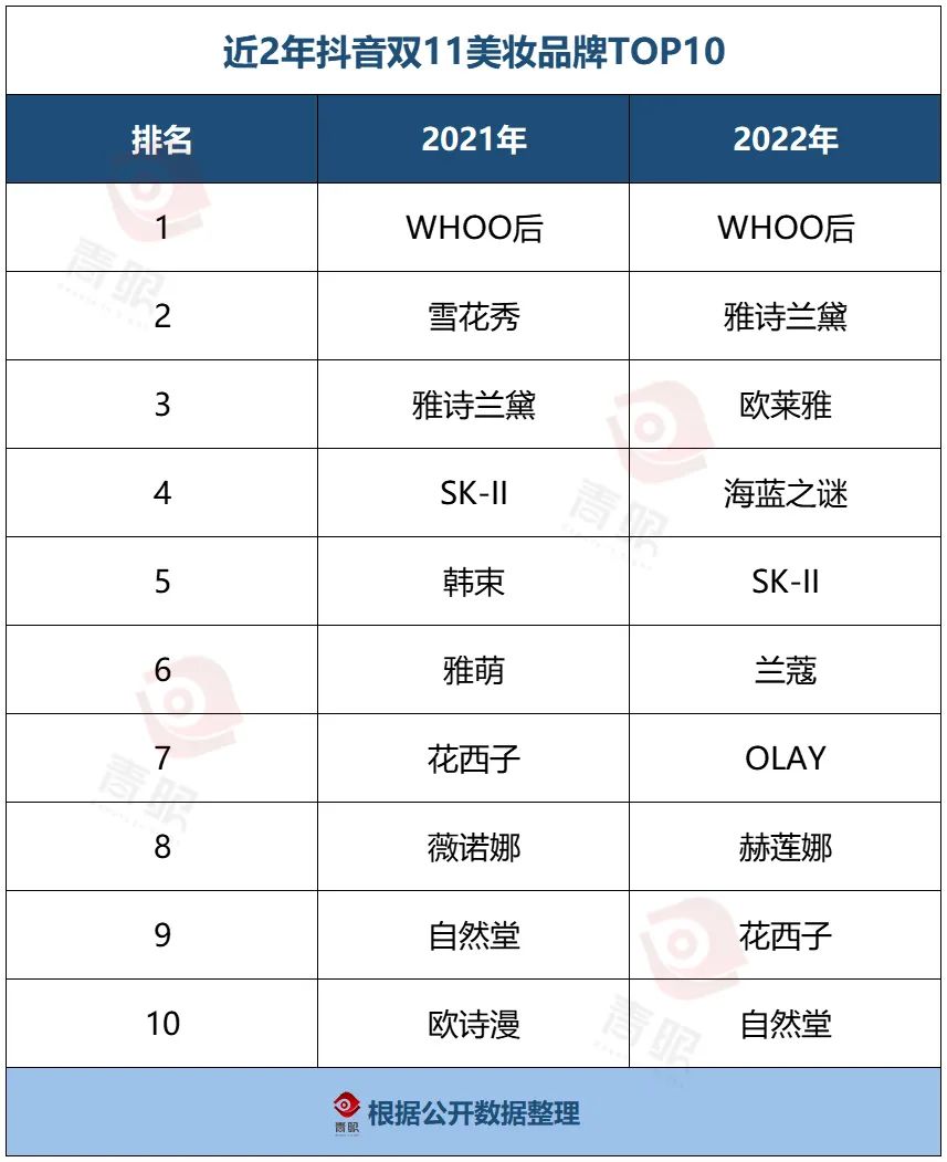 在天貓“落榜”的Whoo后,登上了抖音雙11美妝品牌排名的首位。去年,該品牌也是抖音美妝品牌第一。抖音雙11前三甲的另2個席位被雅詩蘭黛和歐萊雅占據(jù)。