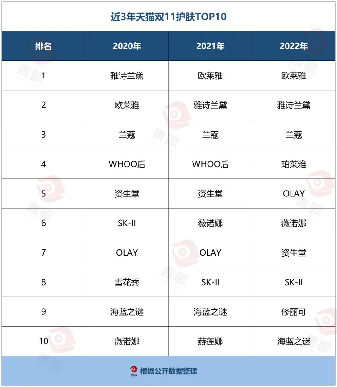 當然,外資不僅在卷國貨,外資與外資之間的較量也愈發(fā)激烈。在2020年和2021年兩年間,始終是雅詩蘭黛排在榜首,今年歐萊雅再次逆襲。曾經(jīng)一度在2019年至2021年連續(xù)3年躋身TOP10的Whoo后,今年則未上榜。