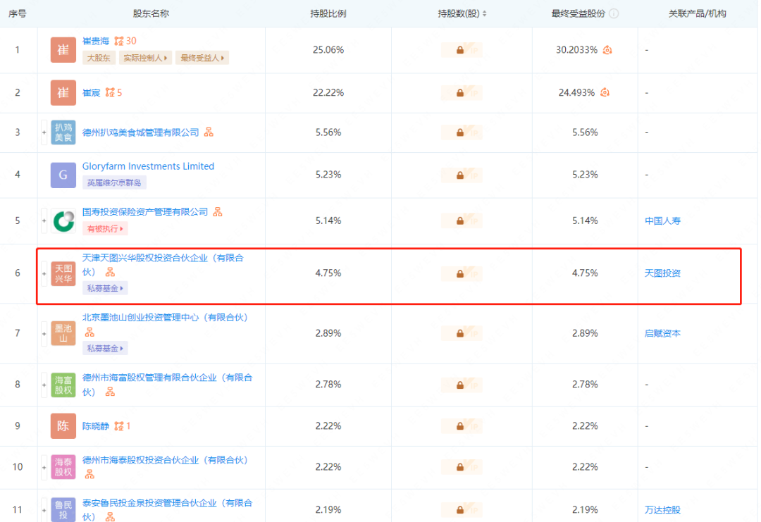 據(jù)招股書顯示,從2020年12月起至2021年3月,短短半年間,天圖資本已將德州扒雞的部分股權(quán)轉(zhuǎn)讓給國壽投資,套現(xiàn)近7900萬元,從曾經(jīng)的第二大股東變?yōu)榈诹,持股比例也越來越低?/p>