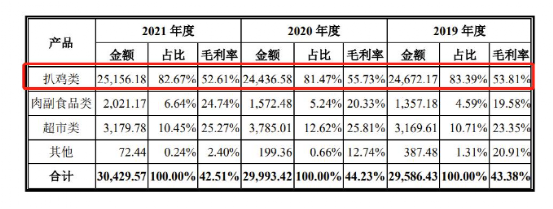 拆解“德州扒雞”企業(yè)類招股書就不難發(fā)現(xiàn),扒雞類產(chǎn)品一直是公司的大頭。其在2019年到2021年的營收分別為4.58億元、4.38億元、4.78億元,占公司總營收比重分別為67.22%、64.66%、66.79%。