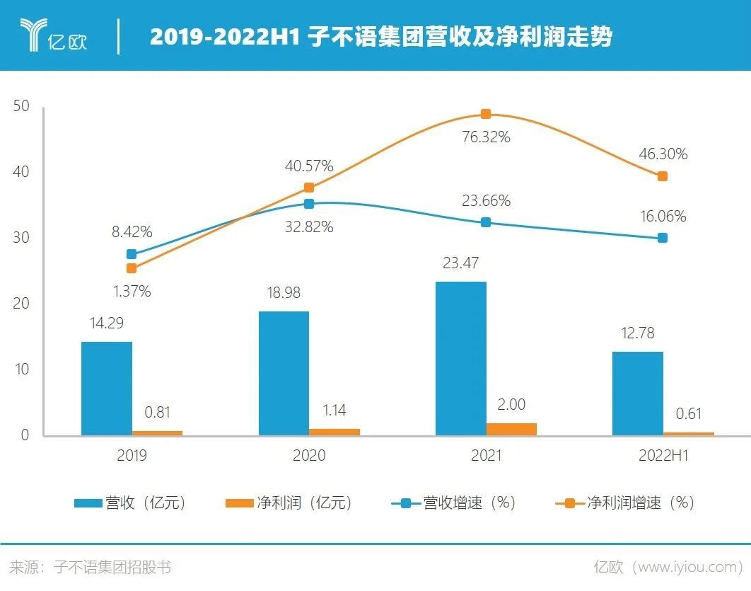 2022年上半年,子不語營(yíng)收為12.78億元,同比增長(zhǎng)16.06%,增速下滑明顯。2019年至2021年,子不語分別實(shí)現(xiàn)營(yíng)收14.29億元、18.98億元、23.47億元,增速分別為8.42%、32.82%、23.66%。