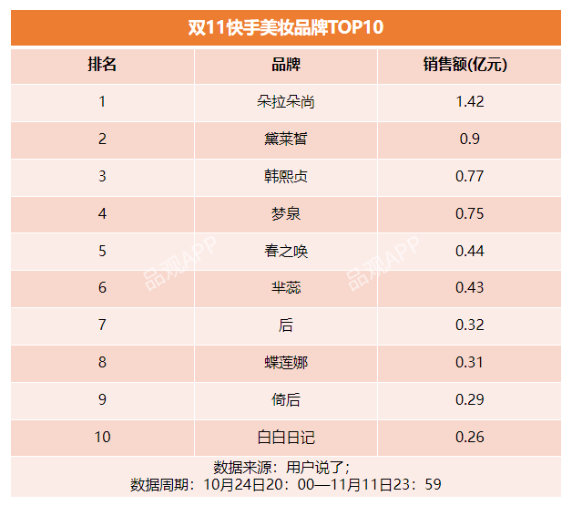 從排名來看,今年雙11期間,國貨品牌在快手平臺沒有特別的亮點,今年快手TOP10中,除了后、韓熙貞,其余8席均為“快品牌”,其中朵拉朵尚、黛萊皙、韓熙貞占據(jù)前三。