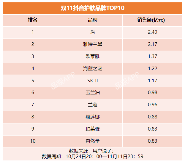 根據(jù)用戶說了數(shù)據(jù),今年雙11期間,天貓平臺美妝總GMV高達420億元,銷量超2億件,TOP20品牌GMV累計超191億元,TOP5品牌GMV均超13億。