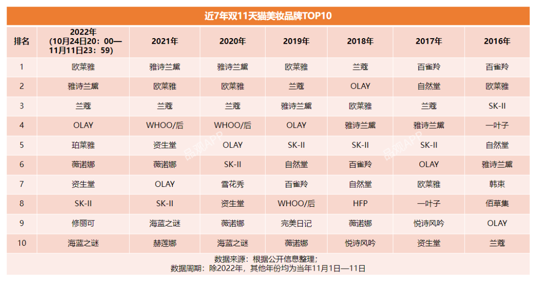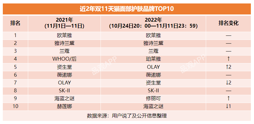 細分至護膚品類,今年雙11天貓護膚品牌TOP10中,有5個品牌維持了去年的排名,珀萊雅、OLAY、修麗可排名上升,資生堂和海藍之謎排名下降。其中,后、赫蓮娜掉出TOP10。