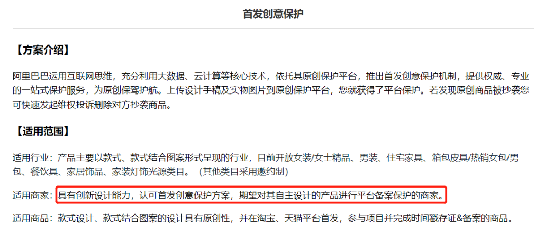 目前,阿里已經(jīng)設(shè)立了阿里巴巴原創(chuàng)保護(hù)平臺(tái),在首發(fā)創(chuàng)意保護(hù)方面,平臺(tái)規(guī)定,上傳設(shè)計(jì)手稿及實(shí)物圖片到原創(chuàng)保護(hù)平臺(tái),就可以獲得平臺(tái)保護(hù),目前主要適用于產(chǎn)品主要以款式、款式結(jié)合圖案形式呈現(xiàn)的行業(yè)。