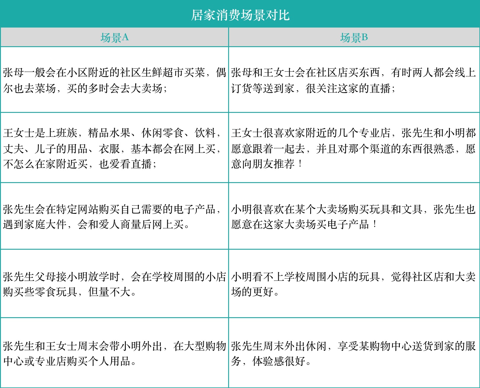 我們說的這個“到位”,是指在顧客的全渠道場景中,占據(jù)主場景份額!拿家庭來舉例子,比如張先生、張?zhí)、小明、張父、張母一?口,可能有以下A/B兩種場景: