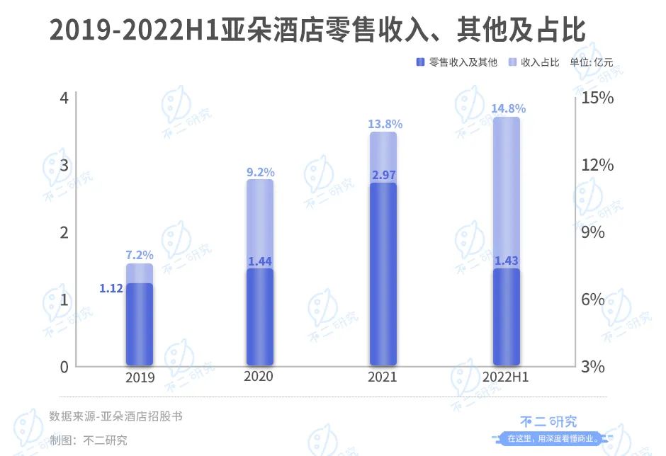 在加盟和直營(yíng)酒店業(yè)務(wù)以外,亞朵推出基于場(chǎng)景的零售業(yè)務(wù)。2019-2022上半年,其零售收入及其他分別為1.12億、1.44億、2.97億和1.43億,總營(yíng)收占比7.2%、9.2%、13.8%和14.8%。