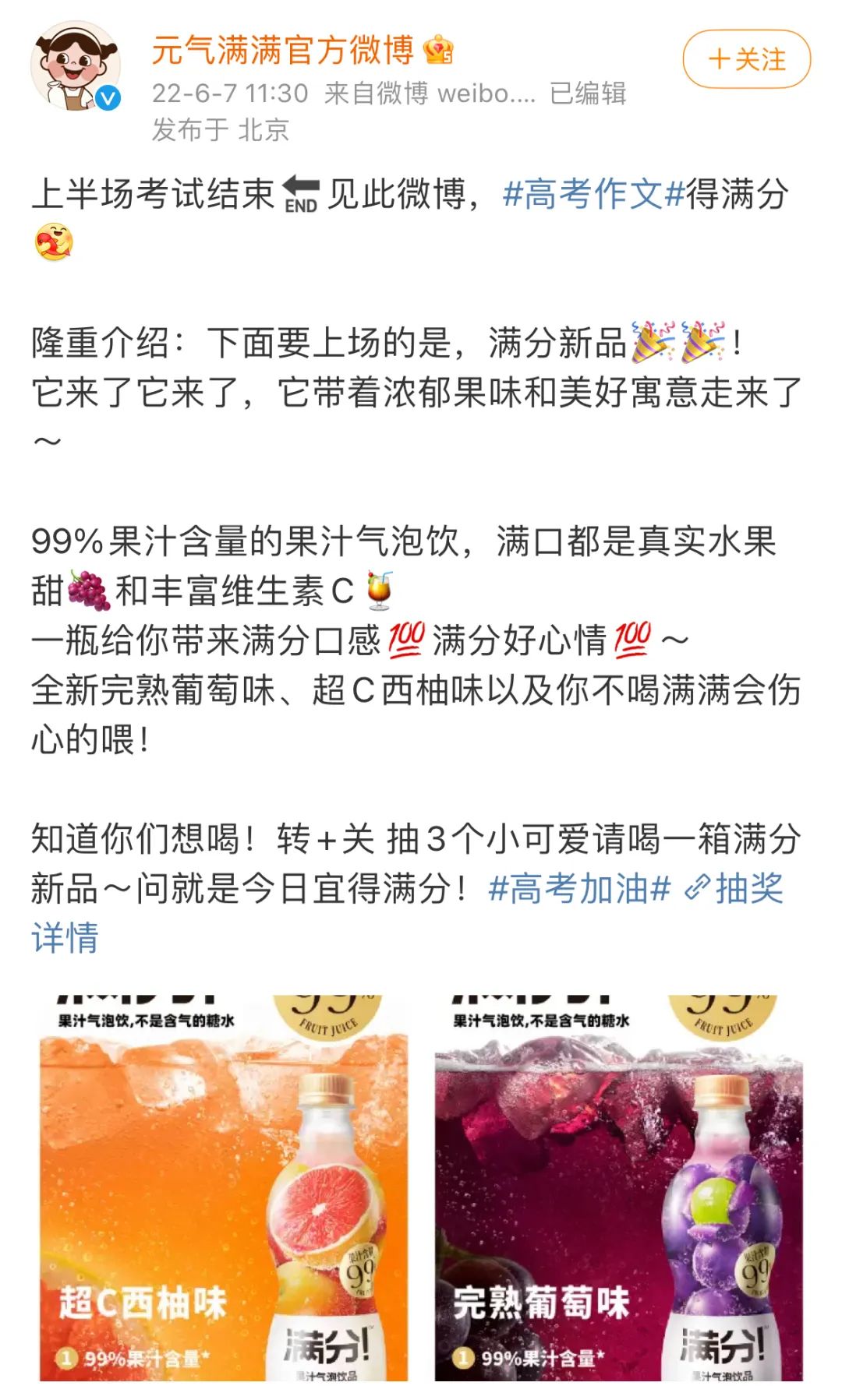 今年6月,滿分悄悄在“元?dú)鉂M滿”官方賬號(hào)走起“支線劇情”!霸?dú)鉂M滿官方微博”宣布推出滿分新品“超C西柚味”和“完熟葡萄味”,同時(shí)在“元?dú)鉂M滿旗艦店”低調(diào)上線新品。