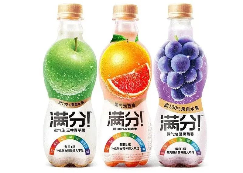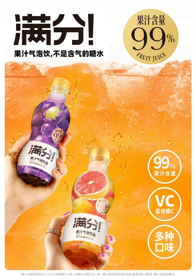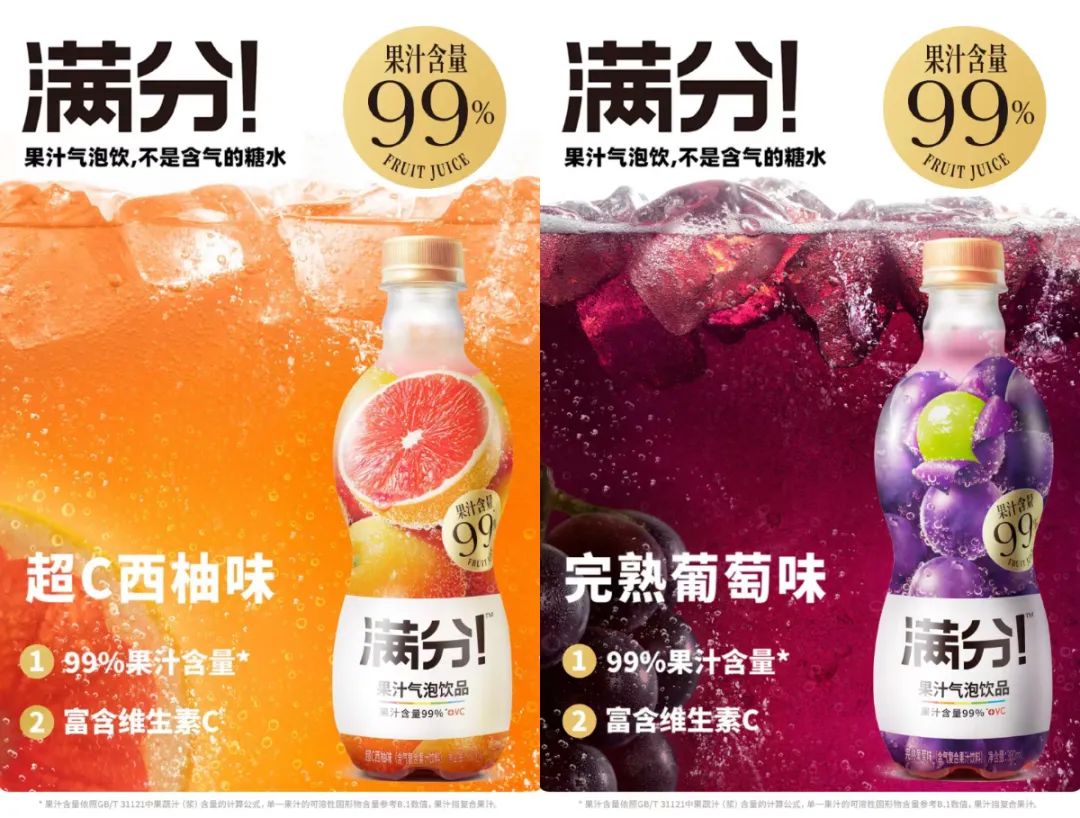 滿分在今年6月測(cè)試時(shí),喊出了“果汁氣泡,每一口都有真實(shí)果汁”的口號(hào)。品牌似乎想要改變消費(fèi)者對(duì)果汁氣泡飲料“并非是使用真實(shí)果汁而是添加劑”的固有認(rèn)知。