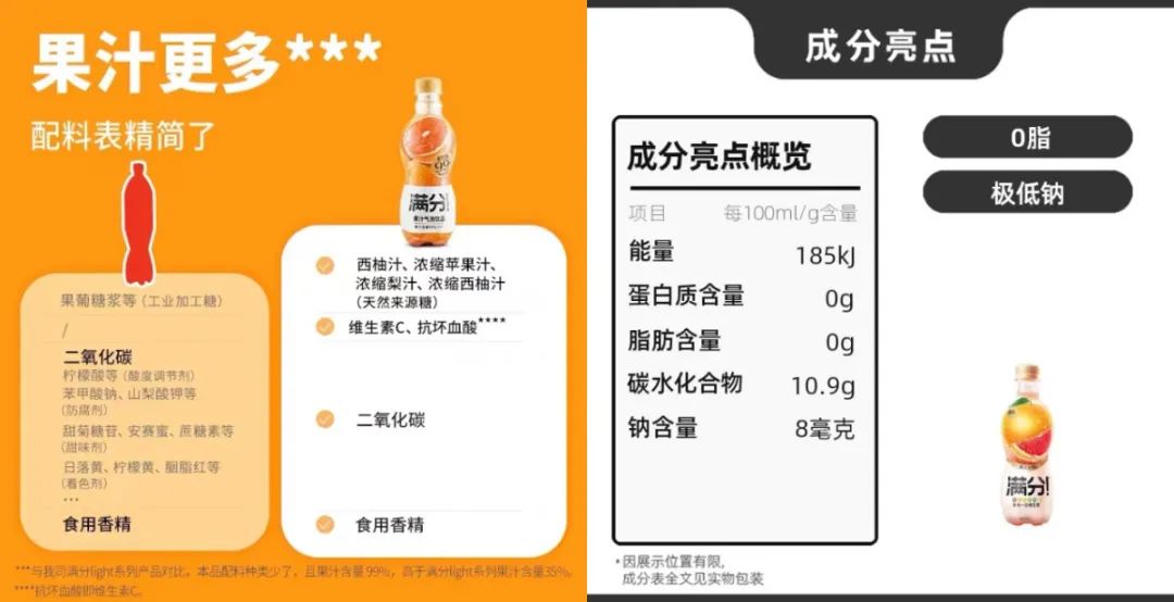 可這樣真的能將滿分的價(jià)值傳遞給消費(fèi)者嗎?我們發(fā)現(xiàn),有部分購(gòu)買滿分的消費(fèi)者,認(rèn)為還是之前標(biāo)注多種營(yíng)養(yǎng)成分的包裝更有價(jià)值感。他們選擇滿分,就是因?yàn)閭鹘y(tǒng)果汁汽水不含各類維生素,且果味來(lái)源于添加劑而非真實(shí)果汁。