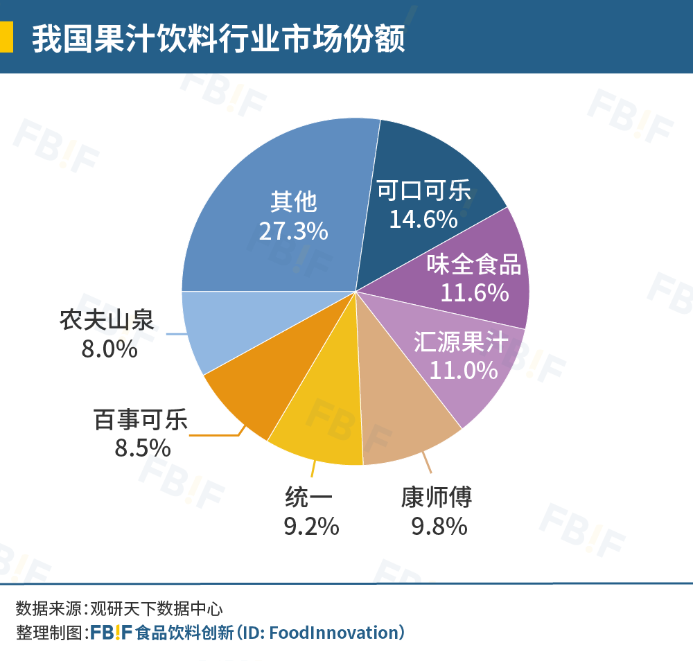 在整個(gè)中國(guó)飲料市場(chǎng),果汁份額正在逐漸縮小。中國(guó)飲料協(xié)會(huì)公布的數(shù)據(jù)顯示,到了2020年,中國(guó)飲料市場(chǎng)開始呈現(xiàn)以包裝飲用水、即飲茶飲料和碳酸飲料為主的新格局,果汁飲料被擠出前三。
