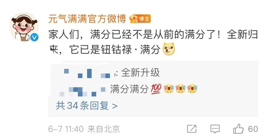 元?dú)鉂M滿官方微博還評(píng)論稱,滿分已經(jīng)不是從前的滿分了,而是“鈕祜祿·滿分”。