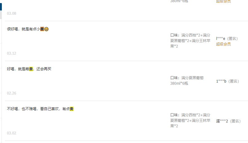 我們了解到,元?dú)馍肿?020年就開始監(jiān)測(cè)用戶對(duì)滿分的評(píng)價(jià)。其中很多用戶反饋滿分喝起來(lái)甜膩、喝完一整瓶有壓力,還有的消費(fèi)者沒(méi)有注意到滿分所宣傳的“富含多種維生素”。