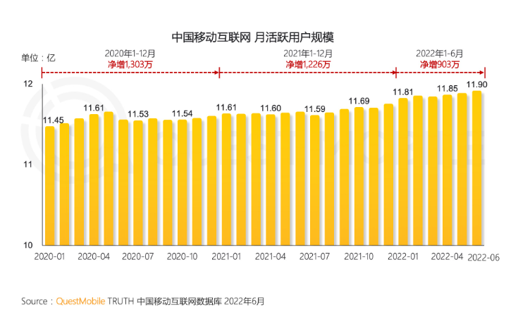 這很大程度上都是因?yàn)橹袊?guó)互聯(lián)網(wǎng)的流量幾近觸頂。QuestMobile發(fā)布的《2022中國(guó)移動(dòng)互聯(lián)網(wǎng)半年大報(bào)告》顯示,截止2022年中,中國(guó)移動(dòng)互聯(lián)網(wǎng)月活用戶規(guī)模為11.9億人,半年時(shí)間僅增長(zhǎng)903萬(wàn)人。