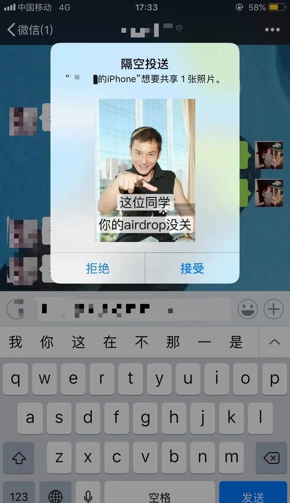 與短信或者微信這樣的界面外提示不同,AirDrop會直接將縮略圖在彈窗在對面的手機。于是,一場無可避免的“視覺強奸”形成了。