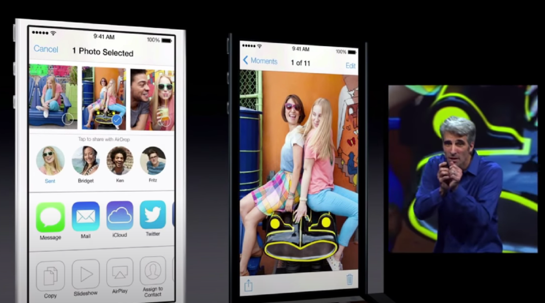 在WWDC 2013發(fā)布會上,蘋果副總裁克雷格·費德里吉,上臺做AirDrop功能演示時,為了突出這一優(yōu)勢,不僅選取了一張背靠背的照片作為傳輸資料,還在演講時補刀“沒有必要在房間里徘徊,互相碰撞你的手機!