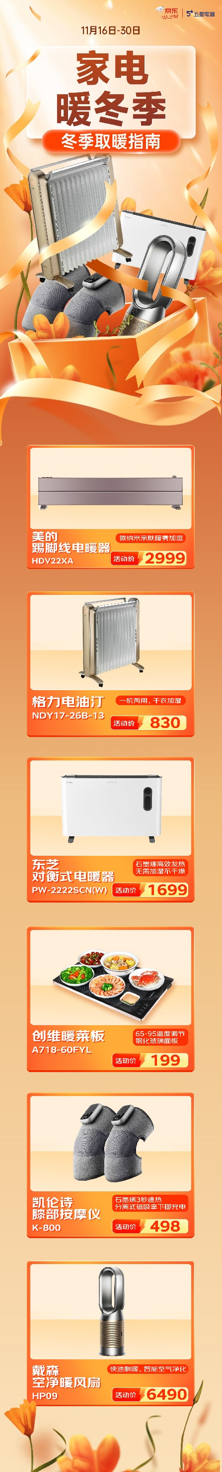 京東五星電器“取暖指南”主推的產(chǎn)品有:具有微納米親膚暖霧加濕的美的踢腳線電暖器HDV22XA,活動價2999元;一機兩用、干衣加濕格力電油汀NDY17-26B-13,活動價830元;石墨烯高效發(fā)熱、無需加濕不干燥的東芝對衡式電暖器PW-2222SCN(W),優(yōu)惠價1699元;65-95溫度調(diào)節(jié)鋼化玻璃面板創(chuàng)維暖菜板A718-60FYL,勁爆價199元;石墨烯3秒速熱、分離式磁吸拿下即充電凱倫詩膝部按摩儀K-800,促銷價498元;快速制暖、智能空氣凈化戴森空凈暖風扇HP09,暖冬價6490元……豐富優(yōu)質(zhì)的爆款制暖小家電,應有盡有,讓消費者可以隨心購買,溫暖一冬。
