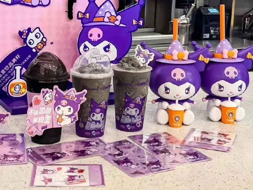 CoCo都可的黑芝麻系列和Kuromi聯(lián)名,官方頭像也換成了紫色的聯(lián)名照,并在北京、杭州、廣州等地開出聯(lián)名主題店;還推出聯(lián)名的萬圣節(jié)產(chǎn)品、庫洛米杯子、吸管等周邊產(chǎn)品,很受年輕人喜愛。