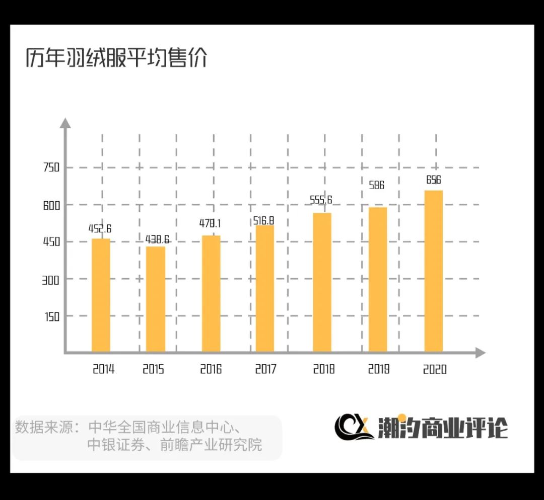 據(jù)中華全國(guó)商業(yè)信息中心統(tǒng)計(jì),2014年至2020年,中國(guó)羽絨服平均單價(jià)由452元漲到656元。