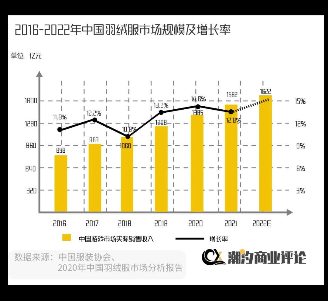 硬幣的兩面雖各自獨(dú)立,但發(fā)展的過(guò)程卻是相互牽連。羽絨服市場(chǎng)的低滲透率,也讓市場(chǎng)越發(fā)充滿可能性。根據(jù)《2020年中國(guó)羽絨服市場(chǎng)分析報(bào)告》顯示,預(yù)計(jì)2022年,中國(guó)羽絨服行業(yè)市場(chǎng)規(guī)模將達(dá)到1622億元。中信證券在研報(bào)中稱,預(yù)計(jì)中國(guó)羽絨服市場(chǎng)未來(lái)至少還有20%以上的增量市場(chǎng)存在。