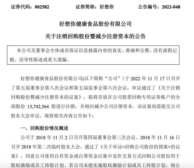 聯(lián)商快訊:11月17日晚間,好想你發(fā)布公告稱,擬將存放在公司股票回購專用證券賬戶的全部股份進(jìn)行注銷,并相應(yīng)減少公司注冊(cè)資本。