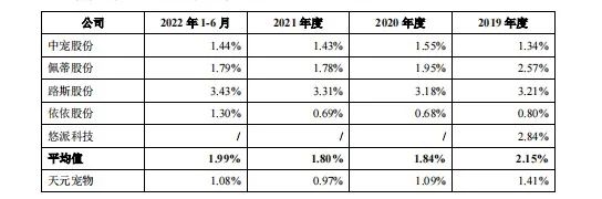 而貼牌銷售模式作為天元寵物進(jìn)入國(guó)際寵物市場(chǎng)的主要方式,在2019 年度至2022年 1-6 月,公司貼牌產(chǎn)品銷售收入占主營(yíng)業(yè)務(wù)收入的比例分別為 87.08%、70.60%、70.96%和68.54%。