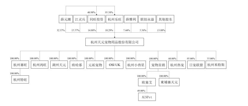 據(jù)招股書顯示,IPO前,天元寵物董事長(zhǎng)、總裁薛元潮直接持有公司 32.37%的股份,并通過杭州樂旺和同旺投資控制公司 25.17%的股份,合計(jì)控制公司 57.54%的股份;薛雅利直接持有公司7.44%的股份。薛元潮、薛雅利兄妹為天元寵物實(shí)際控股人。