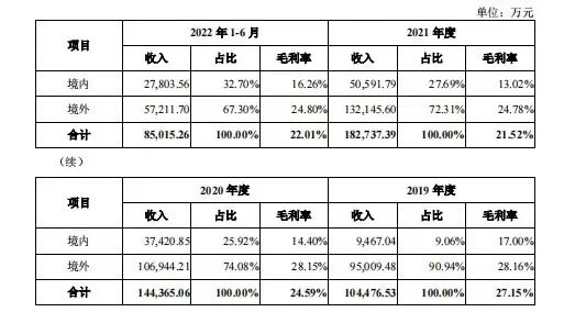 其中,2019 年度至2022年 1-6 月,境外銷售收入占主營(yíng)業(yè)務(wù)收入的比例依次為90.94%、74.08%、72.31%及 67.30%,是公司主要的收入與利潤(rùn)來(lái)源。