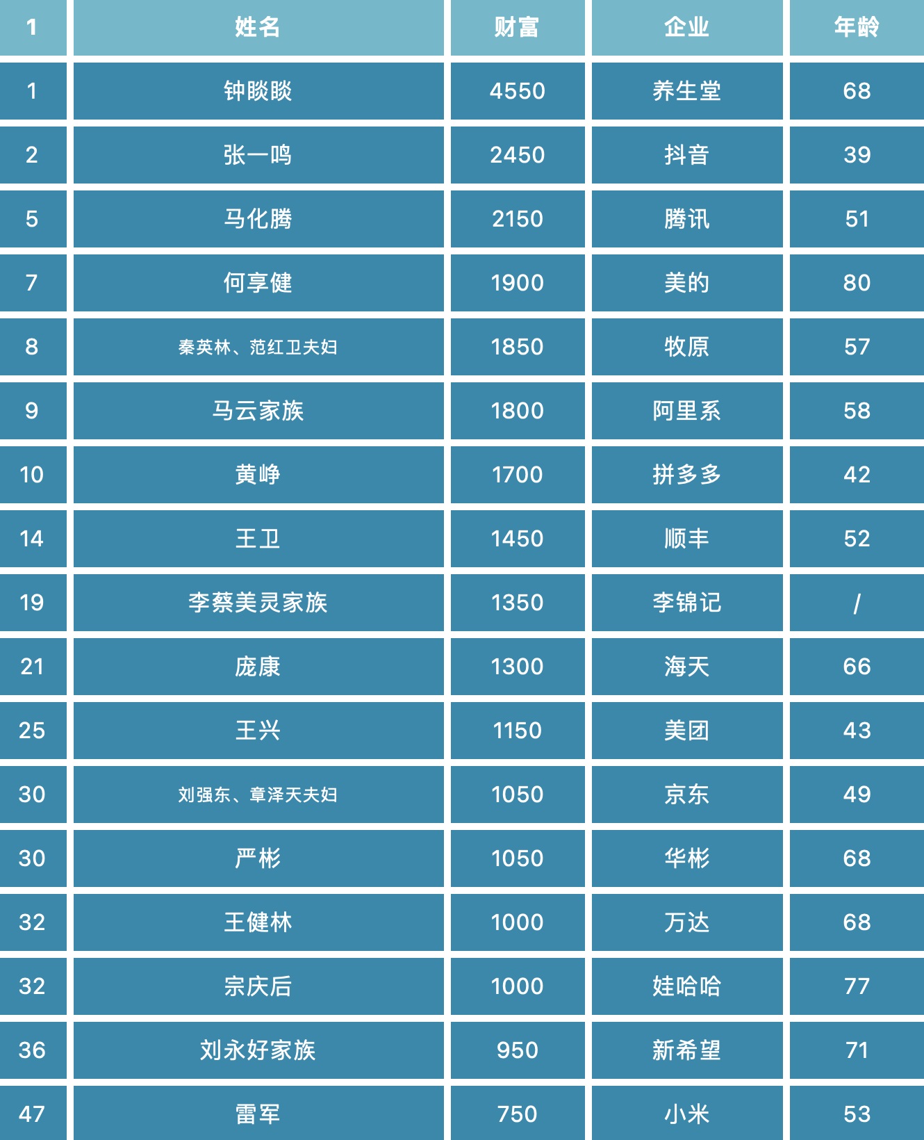 財富單位:億元人民幣 年齡:顯示主要人物