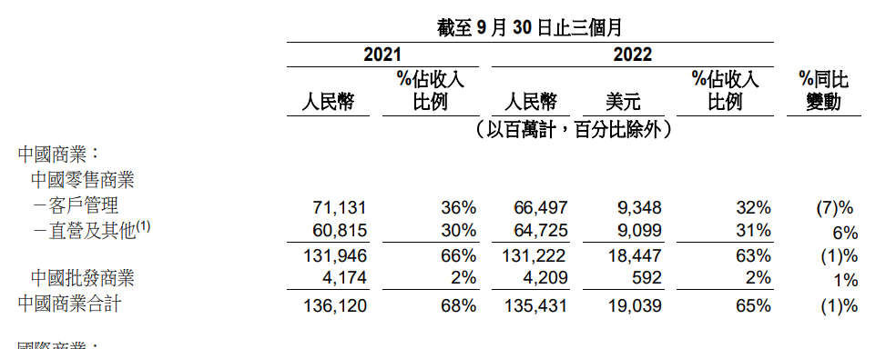 另外,中國(guó)商業(yè)的營(yíng)收中,來(lái)自客戶管理的營(yíng)收為665億元,較去年同期的711億元減少7%。之所以中國(guó)零售業(yè)務(wù)營(yíng)收還能保持僅1%的下滑,那是因?yàn)橹睜I(yíng)及其他實(shí)現(xiàn)了6%的增長(zhǎng),從608億元增長(zhǎng)到647億元。
