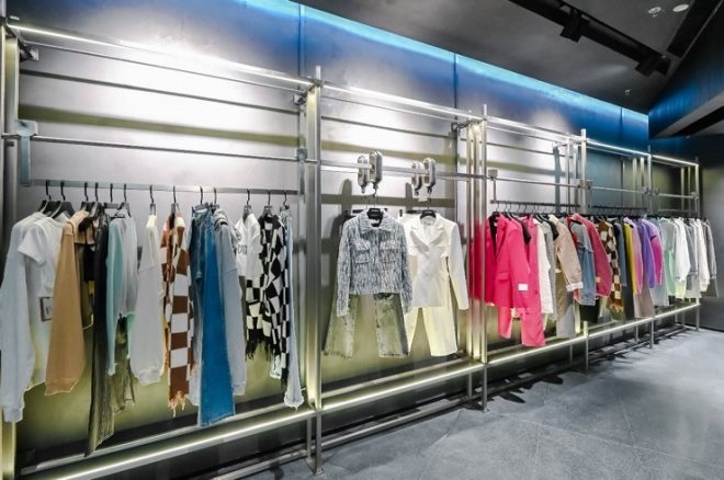 品牌首店以低飽和度的粉色和藍(lán)色為主色調(diào),與品牌溫柔甜美的風(fēng)格完美契合,收銀臺(tái)后的墻壁上掛著除號(hào)形狀的白色熒光燈,衣架圍繞四周墻壁順次擺放,白色大理石展臺(tái)擺放在店鋪中庭位置,上面陳列著帽子、圍巾等配件飾品,靠近試衣間的一側(cè)擺放著墨綠色的面包型沙發(fā)以供顧客休息使用。