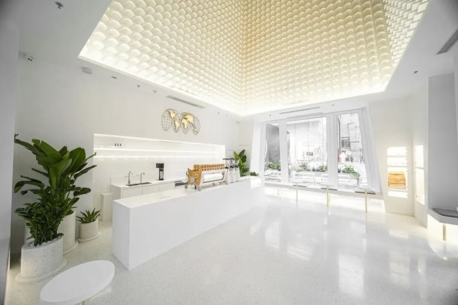 白色釉面的材質(zhì)與% ΔRΔBICΔ 整個(gè)空間相得益彰,最頂部代表匠人精神和咖啡櫻桃的%Logo以一種強(qiáng)有力的姿態(tài)冠蓋整個(gè)空間,展現(xiàn)了西安這座歷史名城的宏偉。