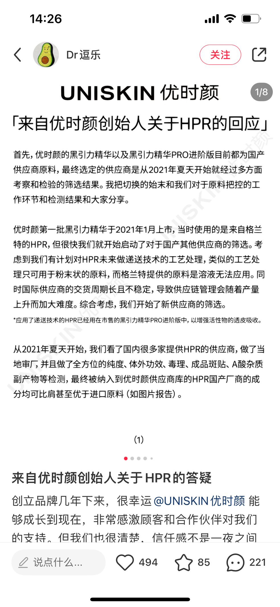 隨著輿論發(fā)酵,11月17日下午,優(yōu)時(shí)顏品牌創(chuàng)始人杜樂(lè)在小紅書(shū)平臺(tái)正式回應(yīng),表示優(yōu)時(shí)顏第一批黑引力精華的確使用了格苒特的HPR原料,但目前,品牌該系列產(chǎn)品都為國(guó)產(chǎn)供應(yīng)商原料。