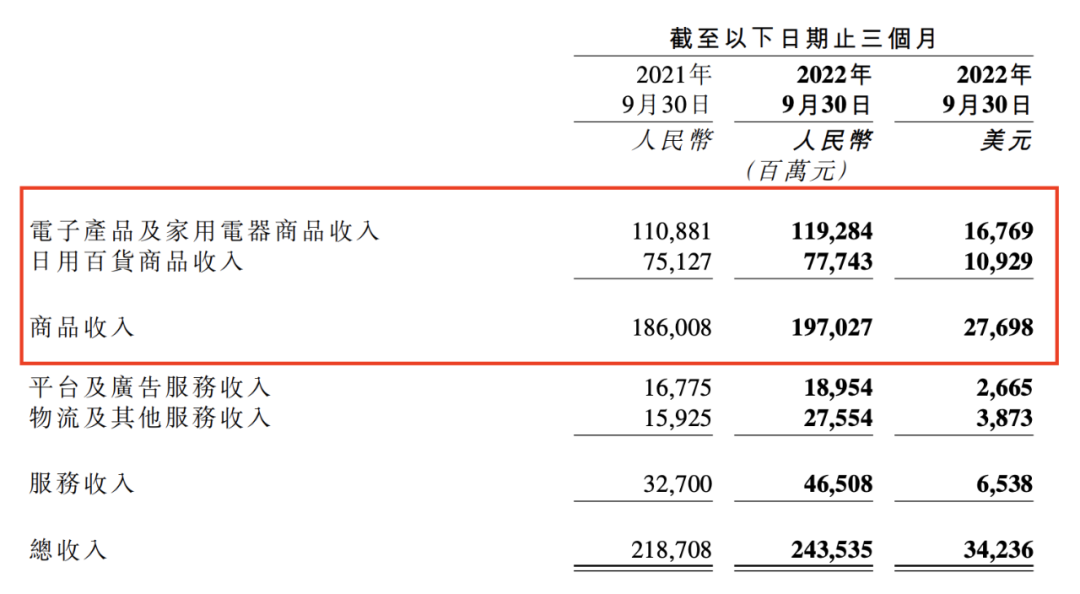 與3C電子表現(xiàn)略超預(yù)期不同,日用百貨商品收入在Q3的表現(xiàn)卻相當(dāng)差勁,當(dāng)季收入777億元,遠(yuǎn)低于預(yù)期的846億,同比增速下降到只有3%,這與往年疫情期間30%以上的增速相差甚遠(yuǎn)。