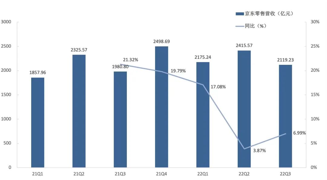 主要受疫情反復、全球性大通脹、美元回流、歐洲能源危機等內(nèi)外部因素影響,我國今年3季度GDP同比增3.9%。所以,基于同期的經(jīng)濟水平,在財報披露前,資本市場普遍看空京東的Q3業(yè)績。