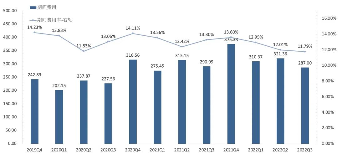 期間費用率自2021Q4起持續(xù)下降,一般行政開支在2022Q3同比下降14.8%至26億元,營銷開支同比下降2.2%至76億元,降本增效成效顯著。而履約開支和研發(fā)開支均有小幅增長,履約費用率的上升與宏觀背景相關,即主要是受到了快消品占比提升,與防疫成本上升影響。