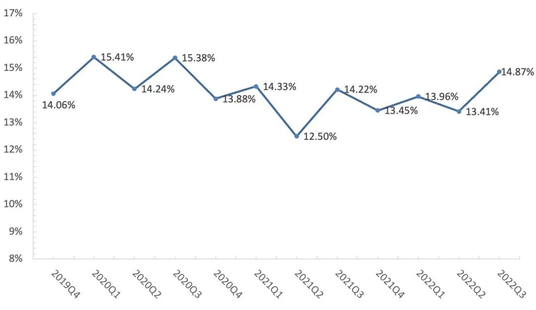 盈利能力方面,京東2019Q4-2022Q3間的單季毛利率中樞在14.14%,總體較為穩(wěn)定。2022Q3,京東毛利率錄得14.87%,同比提升0.65pct,環(huán)比提升1.46pct,主要系公司減少了用戶補貼。