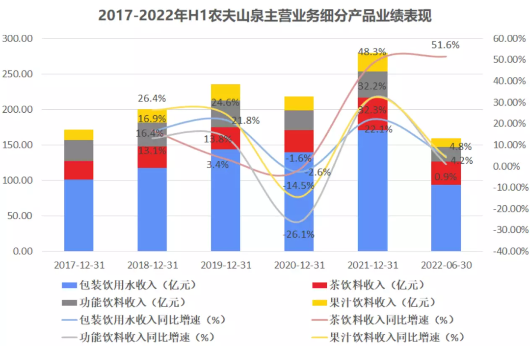 而就AC尼爾森的數(shù)據(jù)顯示,2022年上半年,不論是包裝水還是茶飲料整體市場都增長乏力——包裝水市場整體10.5%下滑,即飲茶市場增速僅為0.8%。但農(nóng)夫山泉之所以能夠在大環(huán)境下保持逆增長,除了飲用水這一業(yè)務(wù)貢獻(xiàn)了5成以上的營收。旗下的茶飲產(chǎn)品—東方樹葉和茶π也為營收增長了做出了第二大貢獻(xiàn)。